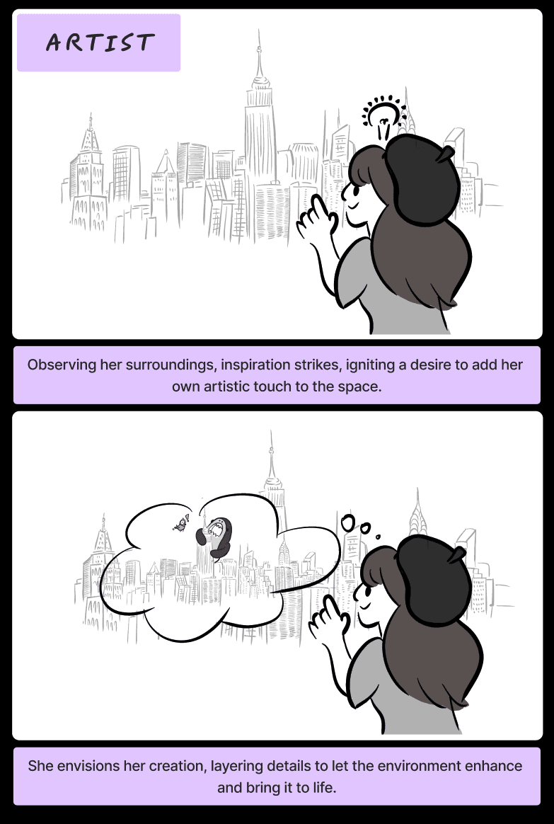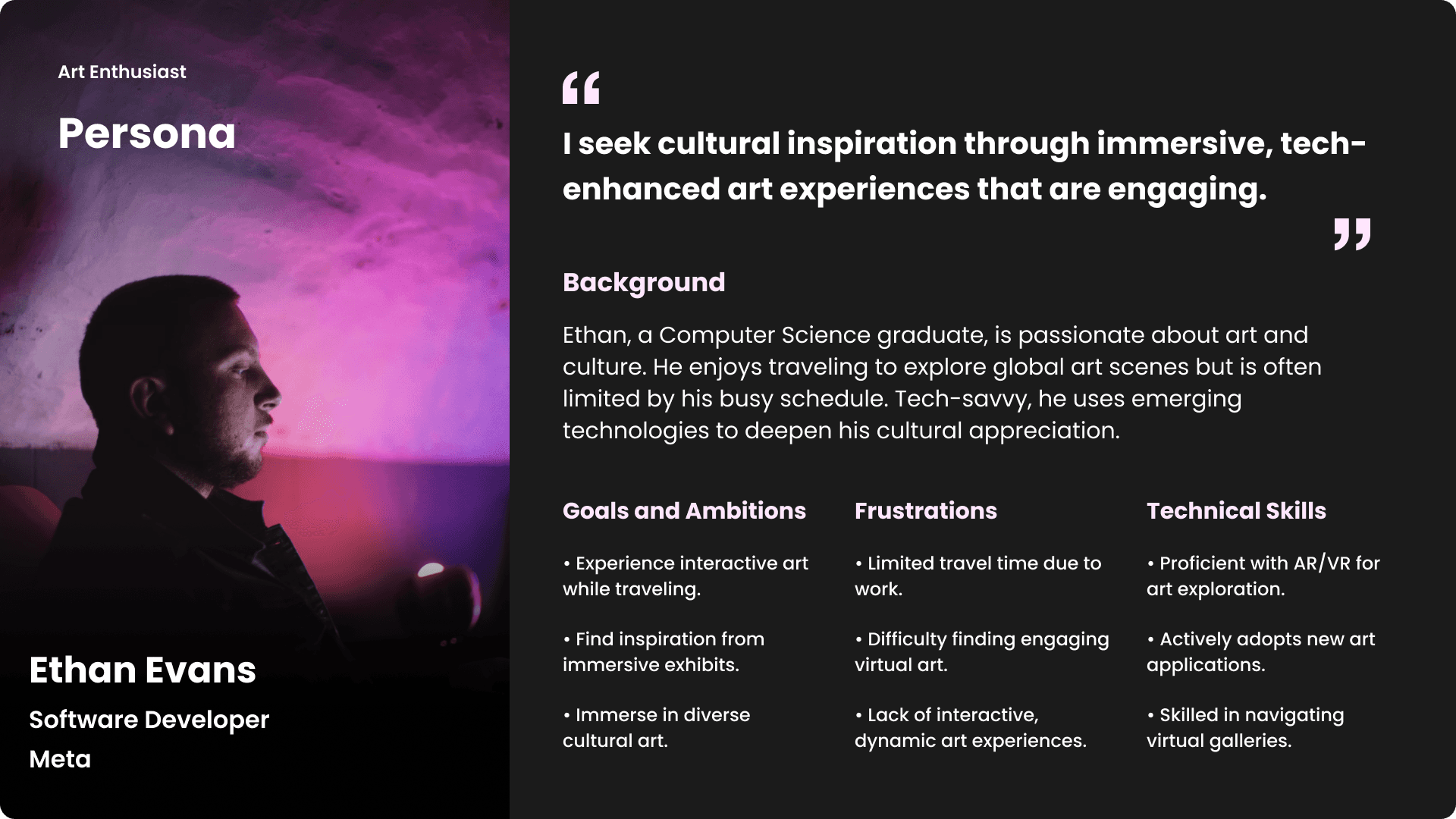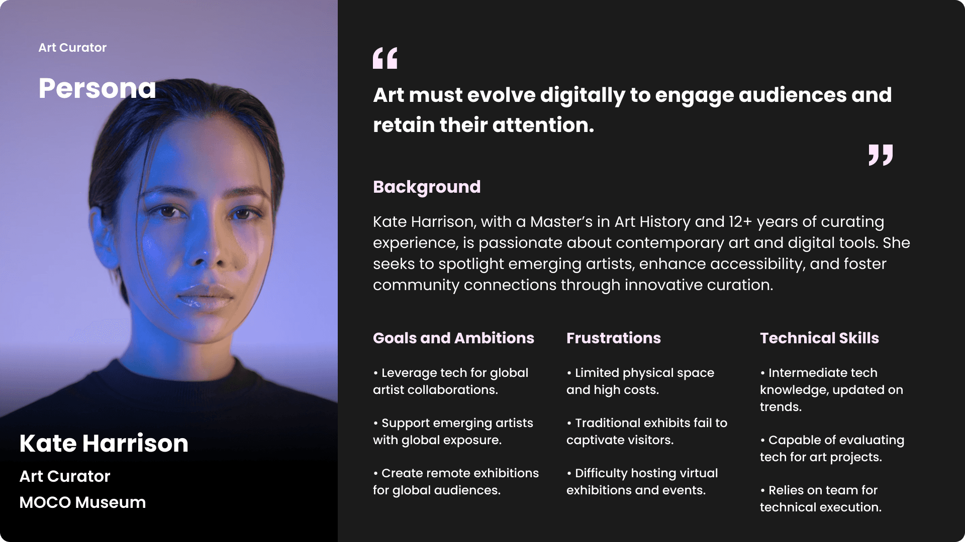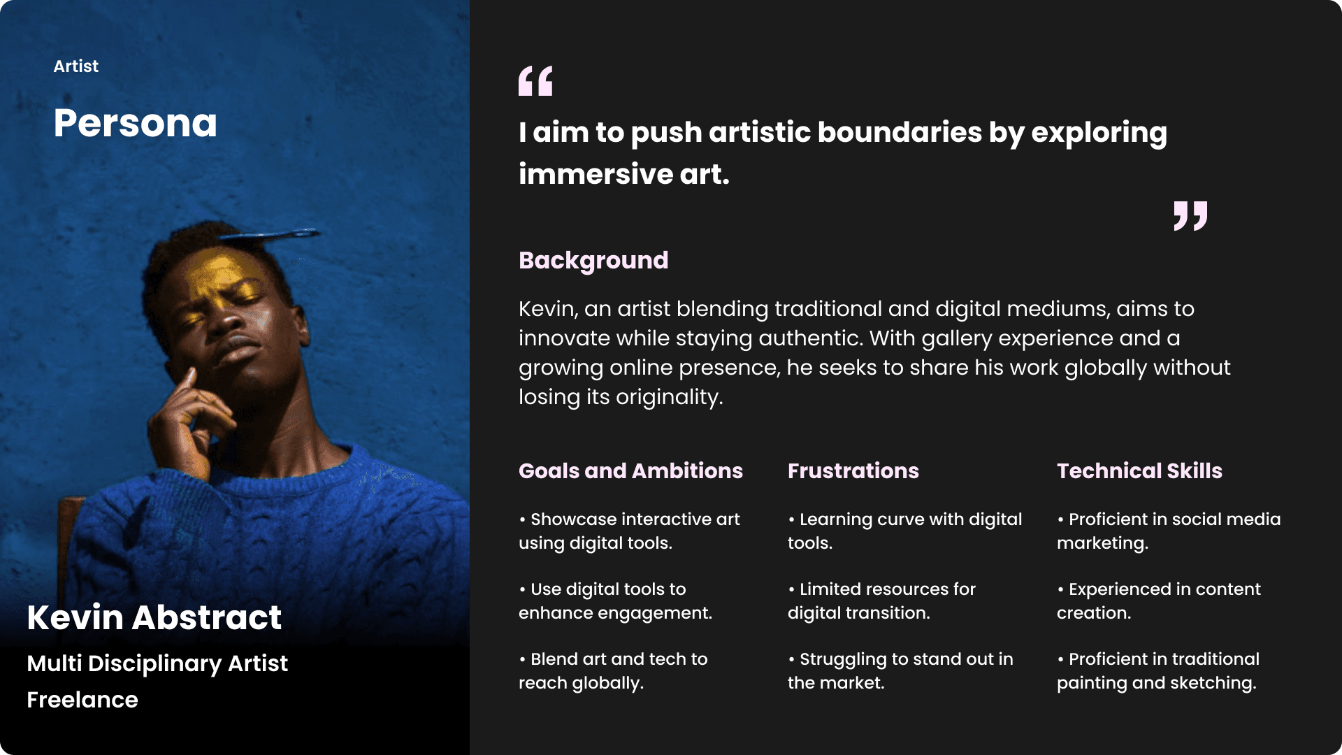 Based on research insights, we developed detailed user personas to represent the platform's key users—artists, viewers, and curators. Each persona captured their goals, pain points, and motivations, helping to align design decisions with user needs and create a more inclusive and intuitive experience.