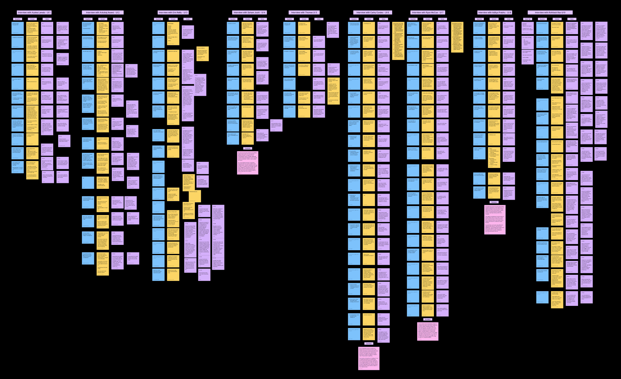 Based on insights gathered from user interviews, we created a Work Activity Affinity Diagram (WAAD) to cluster user activities, goals, and pain points into actionable themes. This process helped us identify key patterns and refine the focus for the synthesis phase.