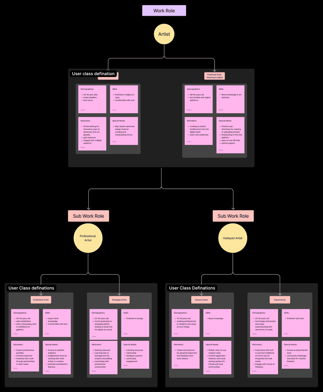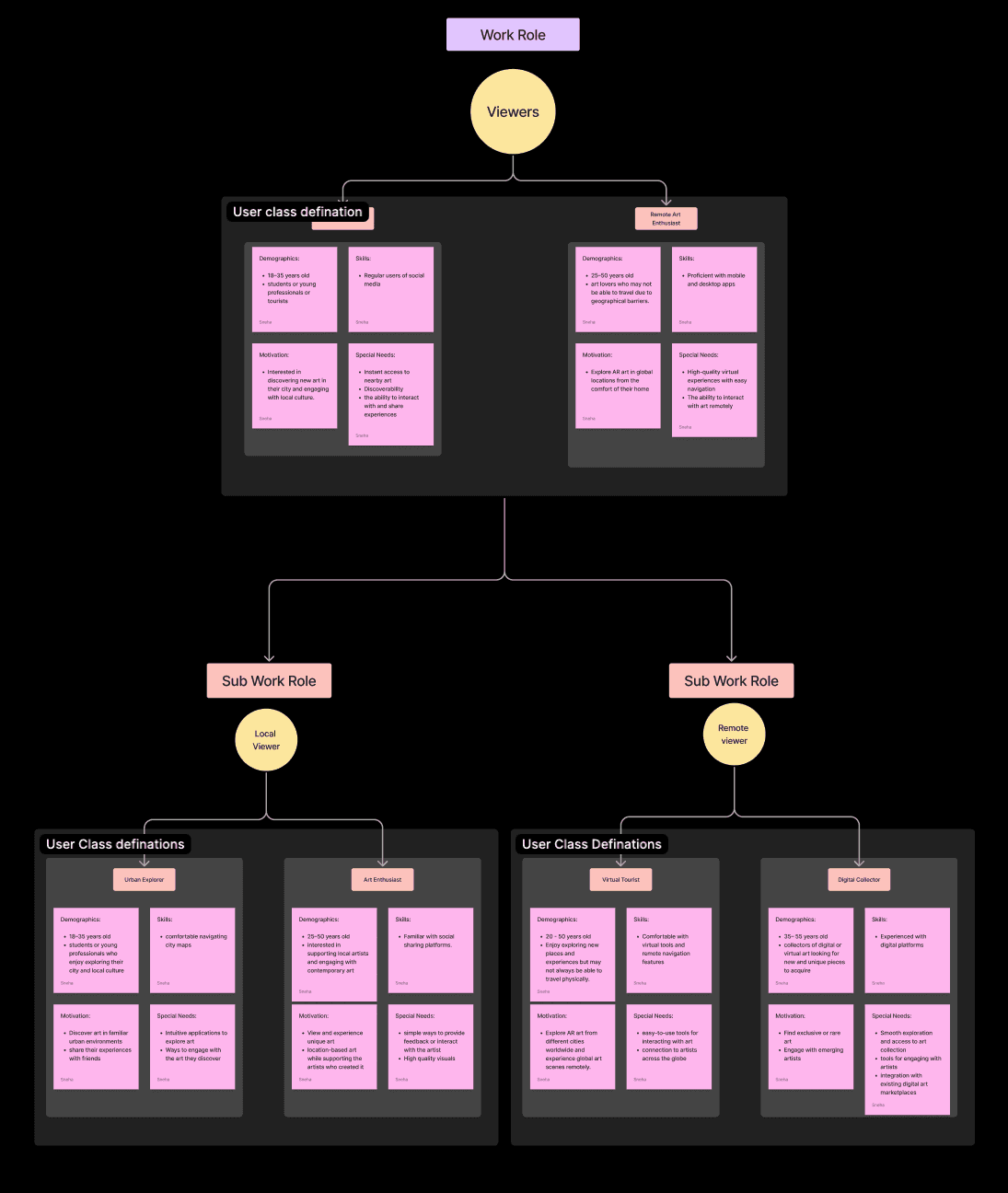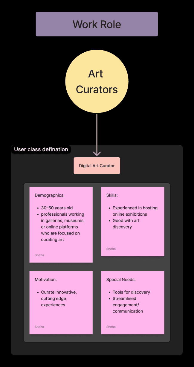 We needed a model to systematically understand user behaviors, goals, and workflows, ensuring the platform addressed diverse needs effectively. After exploring options like HTI, Artifact and Task Sequence Model, we chose the User Work Role Model for its ability to define user groups—artists, viewers, and curators—and align features with their specific roles and interactions.